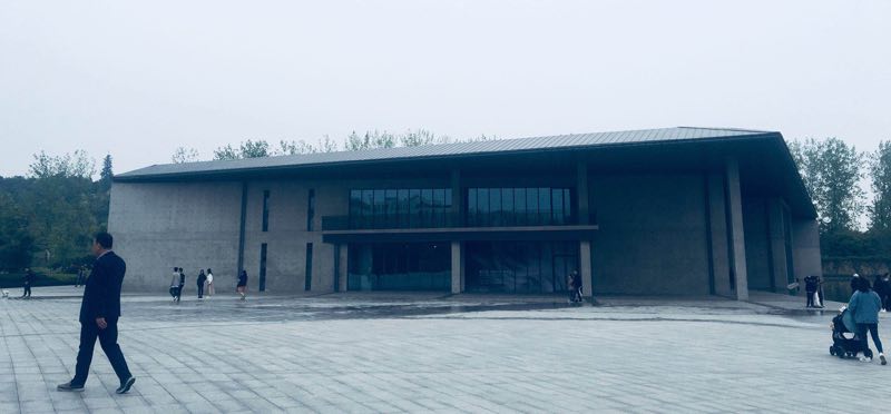 良渚博物院的建筑设计出自英国设计师戴卫·奇普菲尔德之手,外观粗犷、大气,灰白色墙面没有任何装饰,显得简洁而流畅,与周围悠悠小河青青草坪的美丽洲公园相映成趣。