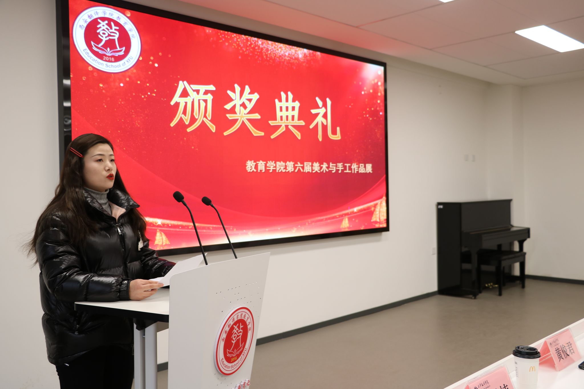 2023年12月22日教育学院在八号楼二楼学术报告厅举行“传承优秀文化,彰显美育特色”——教育学院第六届美术与手工作品展颁奖典礼。莅临颁奖仪式的领导老师有:教育学院党委书记、副院长王小龙,教育学院副院长庞小佳,西安翻译学院美育教学中心主任、教育学院副院长辛维英,教育学院综合办副主任张改宁,教育学院学前教育系主任黄玉芳,教育学院技能教学中心主任张鹤,学前教育系副主任杜赟以及教育学院技能教学中心的美术老师们。