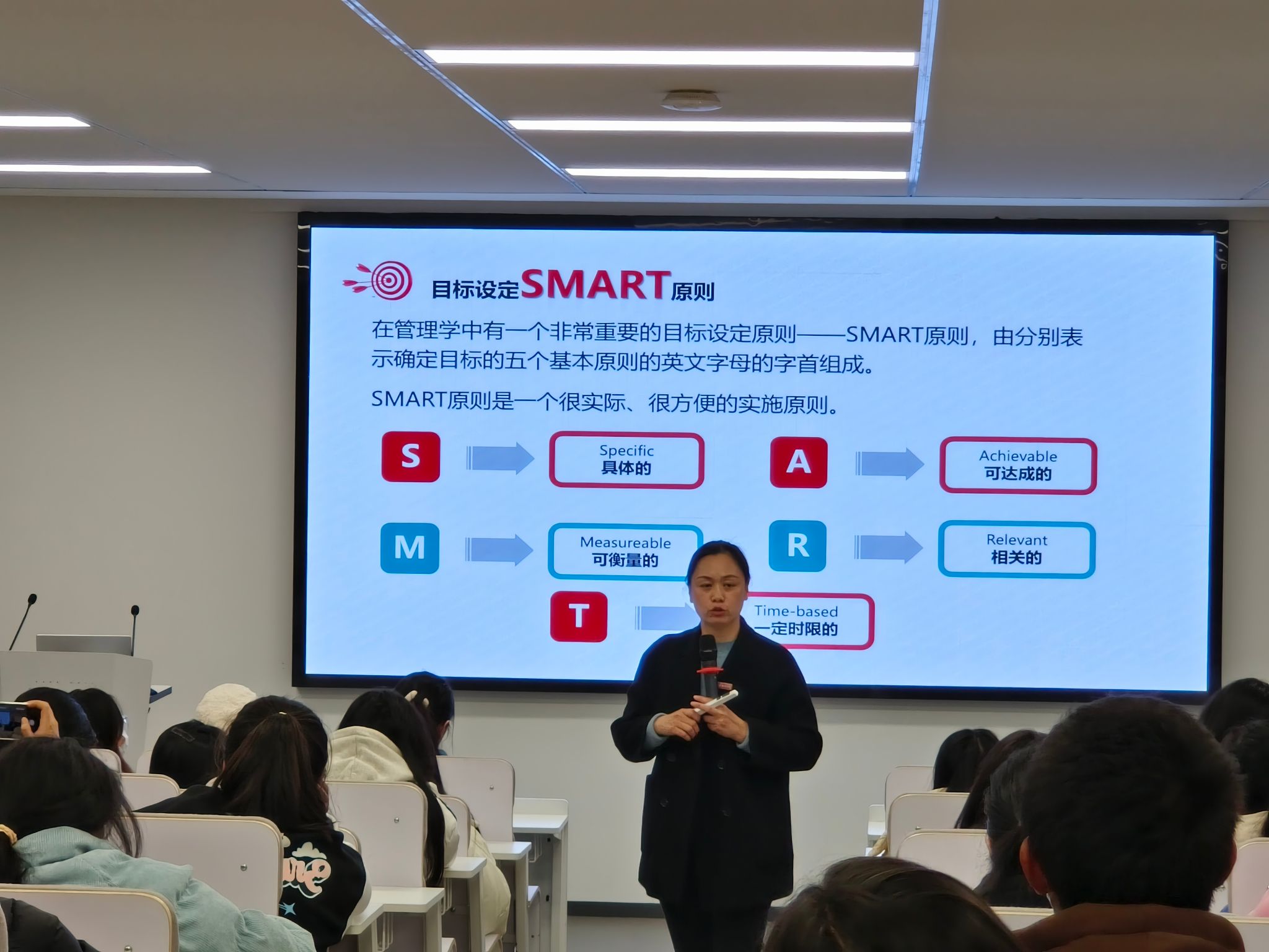 张芳老师从生涯规划的关键因素、生涯规划的标准、目标设定的SMART原则、生涯定位四个方面展开指导与讲解。她指出生涯规划的关键因素在于知己知彼,决策行动;生涯规划的标准在于择我所爱、择我所利、择我所长、择世所需。她还通过现场提问学生“你对大学有着什么样的期待”“要度过什么样的大学生活”进行现场互动,同学们积极分享个人的想法。她鼓励同学们要学会自主学习,广泛阅读书籍,全面发展,从思考中认识自我,不负韶华,规划人生、放飞梦想。