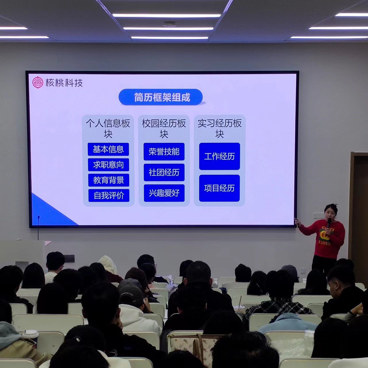 本次讲座邀请到核桃科技招聘总负责人倪妮。她将讲座分为优化简介、应对面试问题、第一印象的形成、求职技巧、求职渠道和毕业生政策六个部分。