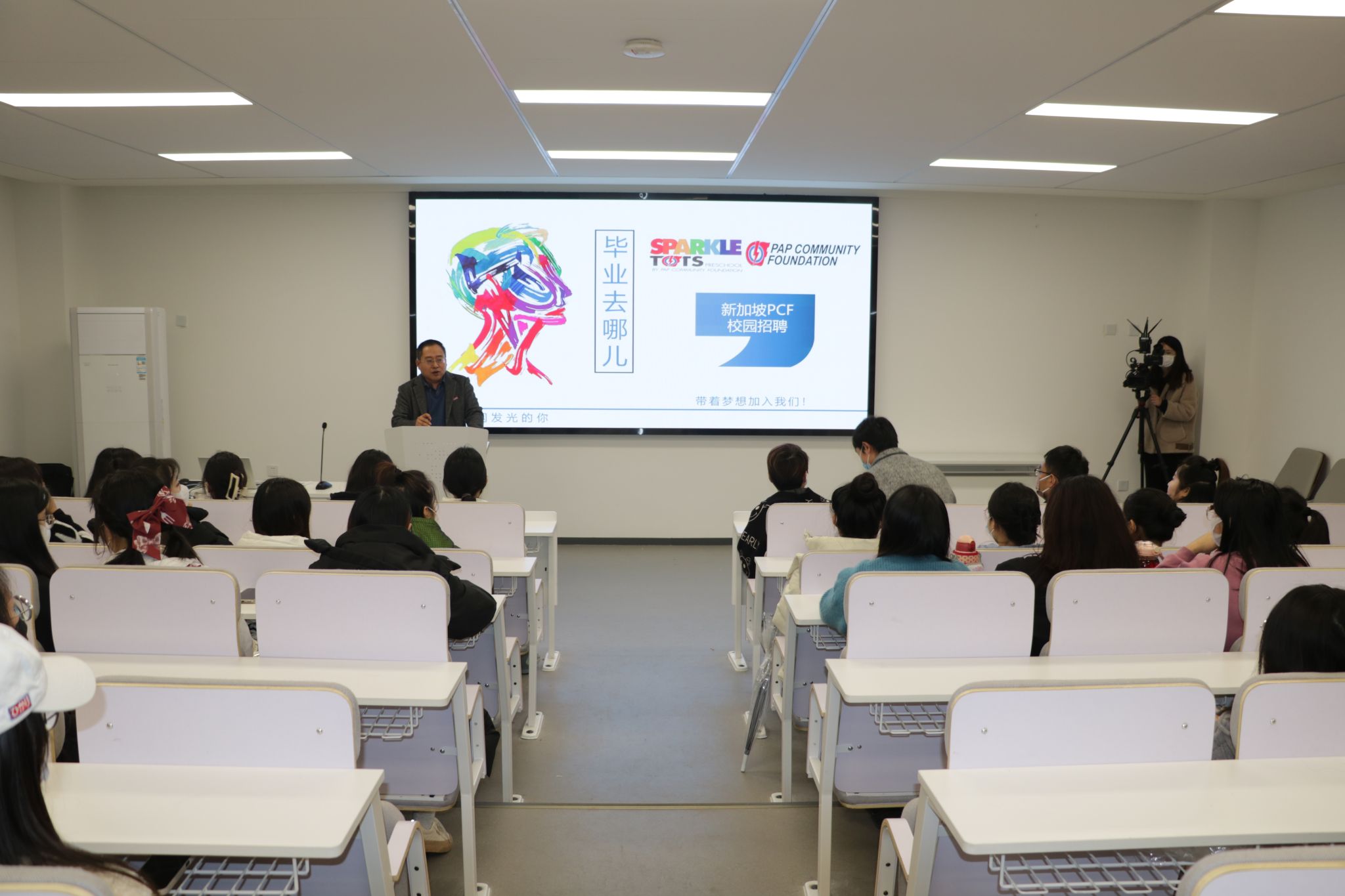 宣讲会上,该基金会项目负责人孙雯莉老师就新加坡幼稚园的发展历程、文化背景、教学理念、职务申请条件、职位待遇等情况做了详细介绍,并生动介绍了新加坡的风土人情,对人民行动党社区基金幼儿园办学宗旨、专业要求、工作环境、教育模式、假期安排及薪资标准等事宜进行了详细说明,并特别介绍了已经在新加坡就业的学生的生活、工作情况。