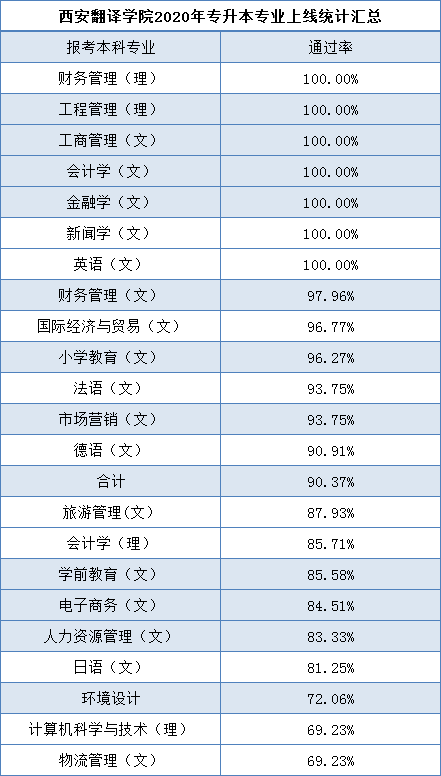 2020年我校专升本考试再创佳绩,参加考试人数及通过率再创历史新高。我校报名参加专升本考生1361人中1230人通过,通过率高达90.37%,尤其值得一提的是我校学生报考的23个专业中,财务管理(理)、工程管理(理)、工商管理(文)、会计学(文)、金融学(文)、新闻学(文)、英语(文)等7个专业的上线率高达100%,13个专业上线率超过90%,19个专业上线率超过80%,其中4名同学数学单科成绩满分,高分段200分以上723人,占到了总通过人数的59%,创造了西安翻译学院专升本历史新高,位列同类院校前列。